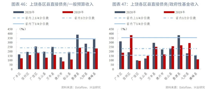 上饶市下辖区县的政府直接债务负担存在分化。由于鄱阳县、余干县的2020年末债务余额未披露,暂不计算直接债务/两种收入指标值。从直接债务/一般预算收入指标来看,广丰区、德兴市指标值较低,分别为166.15%、132.90%,优于省内上1/4分位数;婺源县指标值最高,为388.02%,超过省内下1/4分位数;其余区县则处于省内上1/4分位数和下1/4分位数之间,其中葛阳县、横峰县、光新区和万年县的指标值高于省内中位数。从指标变动来看,各区县均出现不同程度的上升,婺源县增幅最大,同比增长146.65个百分点。从直接债务/政府性基金收入指标来看,广信区(99.96%)、玉山县(120.48%)、横峰县(153.61%)处于省内前25%区间内,且广信区位列省内最优指标值第四;婺源县(381.88%)的指标值为上饶市最高,超过省内下1/4分位数。从指标值变动情况来看,多数区县变动幅度优于省内中位数,其中信州区下降幅度最大,同比下降192.06个百分点;而广丰区的指标值则明显上升,同比增长127.32个百分点;处于省内变动幅度末25%水平。