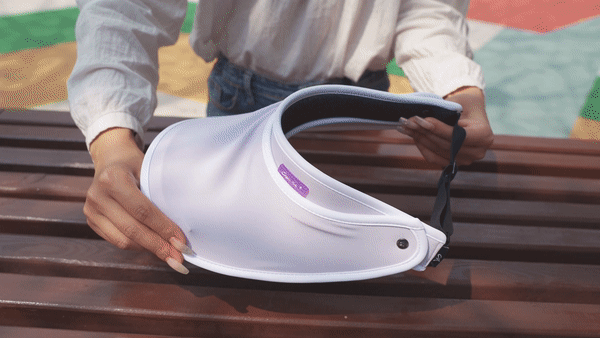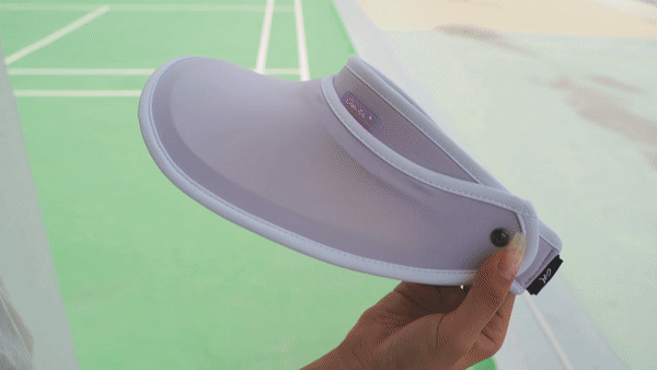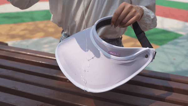 把帽檐拉上去挡住,10秒钟后,logo重新变回透明果冻色的了!可见这顶防晒帽的防护能力有多强啦,阻挡99%以上的紫外线真不是吹的。