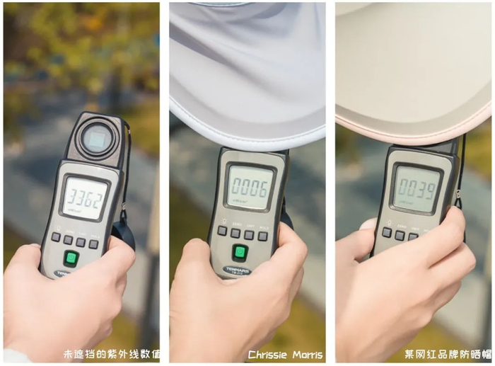 为了进一步测试它的紫外线防护能力,我们也问同事要来了一顶花了她接近200块的网红品牌防晒帽,一起来做个对比测试。