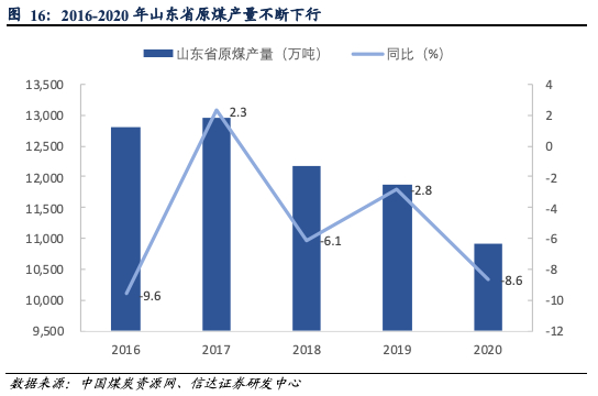 山东省新旧动能转换领导组要求:2021年关掉全省30万吨/年及以下、采深超千米冲击地压煤矿27处,基本都是炼焦煤在产煤矿,合计产能3400万吨。山东是全国第二大炼焦煤产煤省区,炼焦煤核定产能1.27亿吨(2019年)。此次去产能预计将影响焦煤总产能约3%,焦煤供应压力进一步增加。2016年供给侧改革以来,山东省原煤产量呈现逐步下行趋势。2020年原煤产量10922万吨,同比下降8.6%,为近五年来最低水平。山东本身就是用煤大省,2021年关停3400万吨产能如果成功落地,则将进一步加剧区域用煤紧张局势。