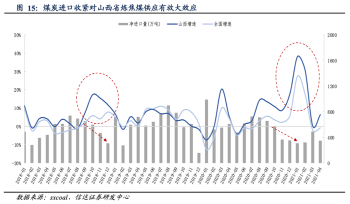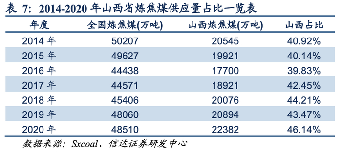 随着进口减少和供需缺口的扩大,国内炼焦煤供应量增加。山西省作为我国煤炭资源储量最丰富的地区,炼焦煤2014-2020年供应量占比超过40%。在国内炼焦煤供应增加时,山西省焦煤供应量增速高于全国。换言之,煤炭进口收紧对山西省炼焦煤供应亦有放大效应。