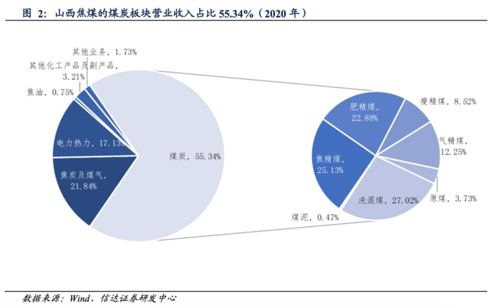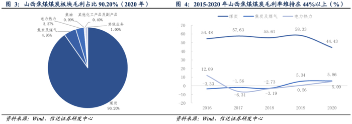山西焦煤坚持“以煤为基、多元发展”战略,产品主要有煤炭、焦炭、电力、煤化工等,主营业务收入主要来自煤炭板块,其产品包括焦煤、肥煤、瘦煤、贫瘦煤、气煤等炼焦煤产品。2020年煤炭板块实现营业收入177.30亿元(占比55.34%),毛利78.77亿元(占比90.20%),毛利率为44.43%,焦炭及煤气、电力热力等其他业务的营收和毛利占比较小且毛利率较低。