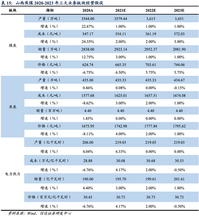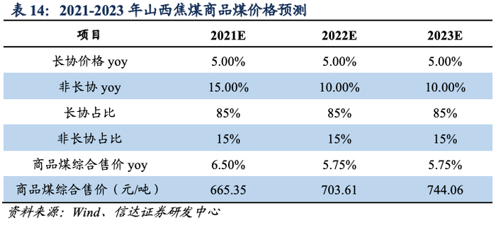 假设2021-2023年山西焦煤销售长协占比85%,预计2021-2023年煤炭价格同比增6.50%/5.75%/5.75%。