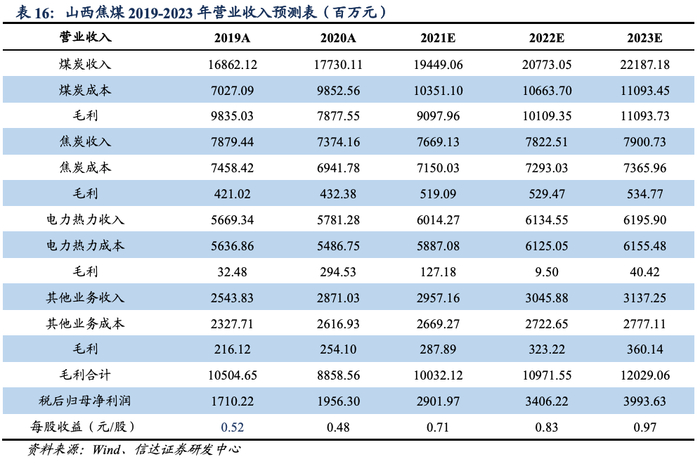 基于以上假设,我们预测山西焦煤2021-2023年营业收入同比保持9.51%/4.67%/4.35%的增长,对应EPS分别为0.71/0.83/0.97元/股。