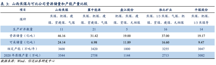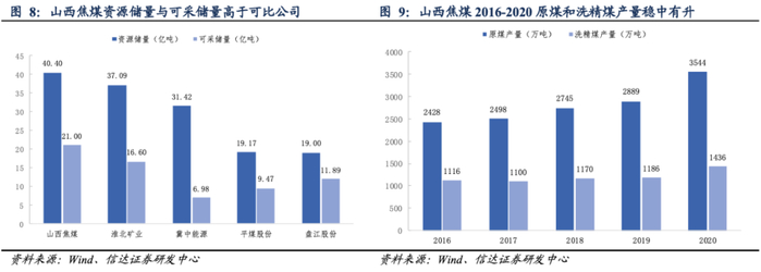 坐拥优质炼焦煤资源,奠定龙头地位和长期发展基础。山西焦煤生产矿区位于国家大型煤炭规划基地的晋中基地,坐拥丰富炼焦煤资源,富含焦煤、肥煤等优质稀缺煤种,具有低灰分、低硫分、结焦性好等优点,是我国最为优质的炼焦煤基地。截止2020年底,山西焦煤资源储量(46.16亿吨)、可采储量(24.14亿吨)、原煤产量(3544万吨)与可比公司相比,均位列板块第一,炼焦煤龙头地位彰显。