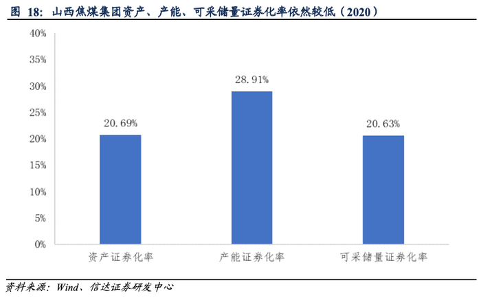 按照储量比重的证券化率分析:截至2020年末,上市公司山西焦煤在收购完成后,资源储量46.16亿吨,可采储量24.14亿吨,集团煤炭储量证券化率20.52%,按照可采储量比重测算的证券化率20.63%。
