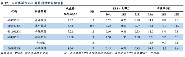 预计公司2021-2023年每股收益EPS值为0.71/0.83/0.97元(原预测0.64/0.67/0.69元),对应最新收盘价格(2021/06/22),计算PE值为11.3/9.6/8.2倍。综合考虑山西焦煤炼焦煤资源稀缺性,以及资产注入预期下企业竞争优势有望持续强化,业绩增长将带动公司估值修复。我们给予公司2021年15倍PE,对应6个月目标价为11元,维持公司“买入”评级。