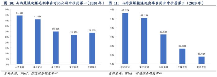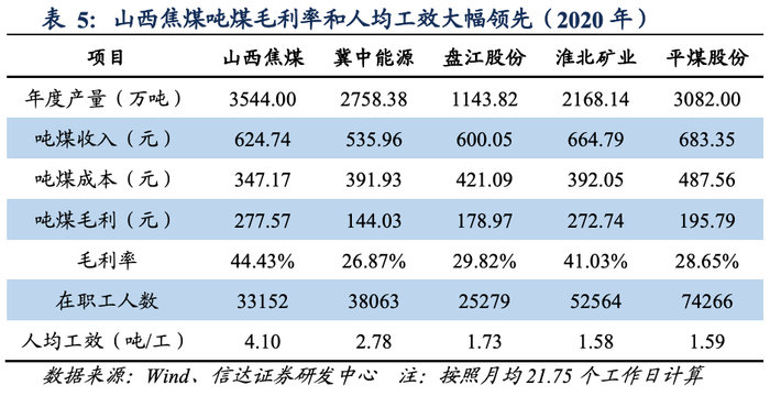 经营效率突出,并有望进一步提升。毛利率方面,享低成本优势,煤炭业务盈利能力较强。2020年山西焦煤吨煤成本为347.17元/吨,毛利率为44.43%,领先于可比公司。人均工效方面,2020年山西焦煤人均工效为4.10,远高于同期可比公司。且从公司改革发展方向上看,进一步推进煤矿智能化建设、压缩层级、减员提效也是值得期待的方向。