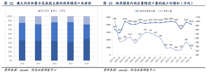 2020年8月以来从澳大利亚进口炼焦煤明显减少,8-12月进口同比下降32.85%/38.76%/21.45%/90.37%/100%;同期,我国炼焦煤净进口量为714/657/581/367/365万吨,呈现持续下滑趋势。