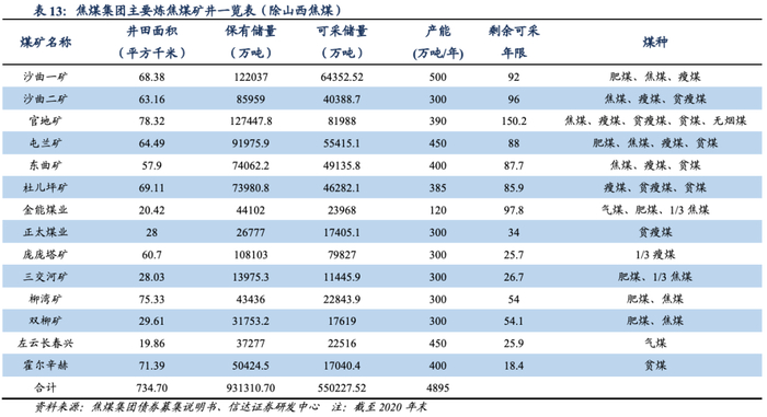 焦煤集团上市公司包括山西焦煤、山西焦化股份有限公司(下称“山西焦化”)和南风化工集团股份有限公司(下称“南风化工”)。山西焦煤的主营业务为煤炭的生产、洗选加工、销售及发供电等;山西焦化主要制造炼焦生产、煤焦油加工、粗苯精制等煤化工产品;南风化工主营无机盐化工业务。在煤炭资源整合和专业化重组的背景下,焦煤集团有望将优质炼焦煤资产注入上市主体山西焦煤。