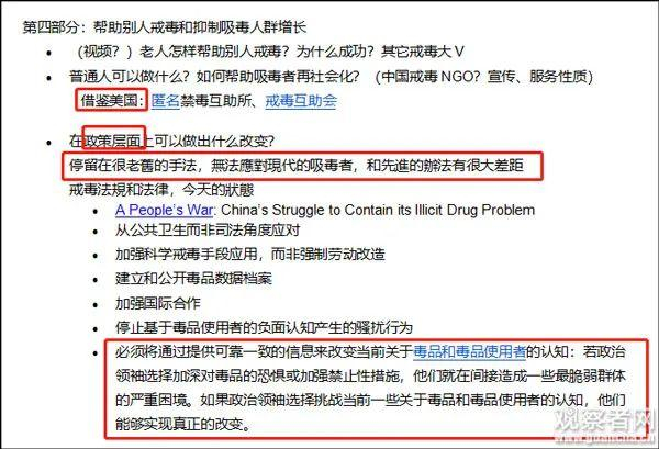 第四部分,提出让“中国借鉴美国”的建议,甚至把中国根据国情采取的与时俱进的戒毒措施贬低为“停留在很老旧的手法,无法应对现代的吸毒者,和先进的办法有很大差距”,最后直接上升到“政策层面”,开始“政治污蔑”。