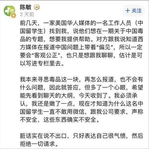 陈敏说,他当时告诉对方,自己对“美国媒体报道中国的客观度不是很信任”,随后该留学生为了打消他的疑虑,解释称自己也知道“西方媒体对中国的报道很有偏见,所以希望找他来了解真实、客观的一些事情”。