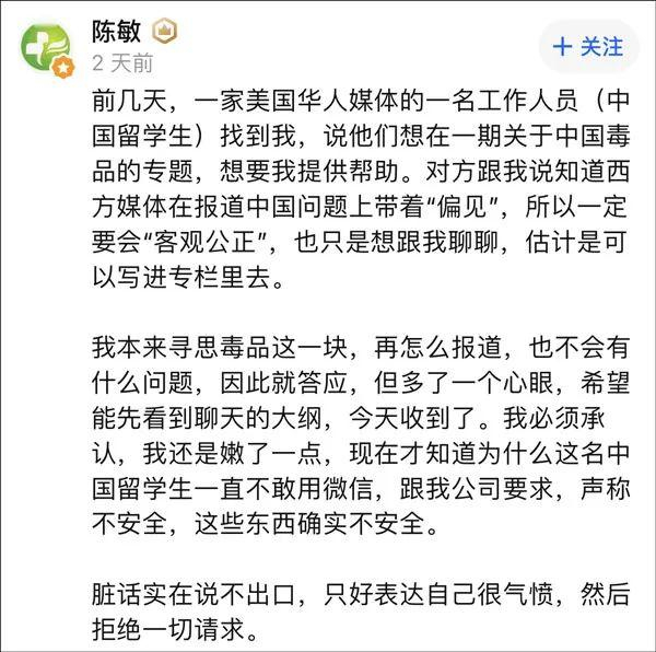 今年6月16日,他收到了一个中国籍女留学生的知乎私信,对方自称来自一家美国华人媒体(负责人是华裔),声称联系陈敏的目的是“想做关于中国的毒品专栏,想了解一下中国毒品的问题”。
