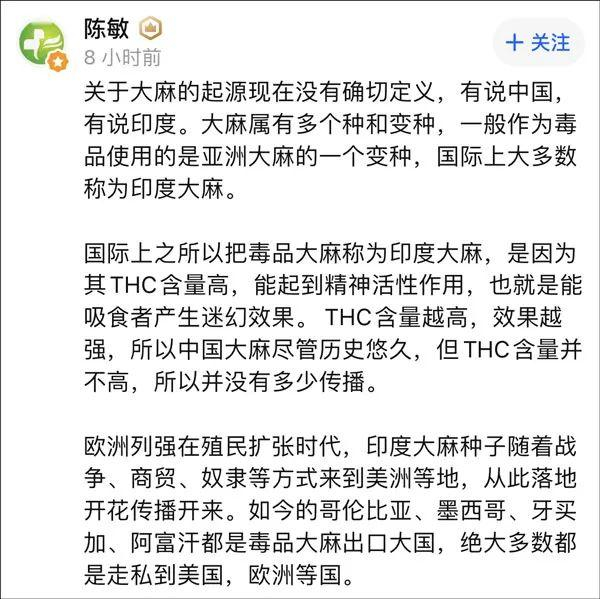 对于“西方大麻来自中国”的说法,@陈敏 转发辟谣称:“国际上之所以把毒品大麻称为印度大麻,是因为其THC(四氢大麻酚)含量高,能起到精神活性作用,也就是能让吸食者产生迷幻效果。THC含量越高,效果越强,所以中国大麻尽管历史悠久,但THC含量并不高,所以并没有多少传播。”