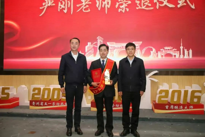4月14日,茅台集团举行首席酿造师严刚荣退暨终身名誉酿造大师聘任仪式,以高规格欢送严刚光荣退休,并授予“终身名誉酿造大师”称号,高卫东、李静仁亲自为严刚颁发 “终身名誉酿造大师”奖杯、绶带和证书。