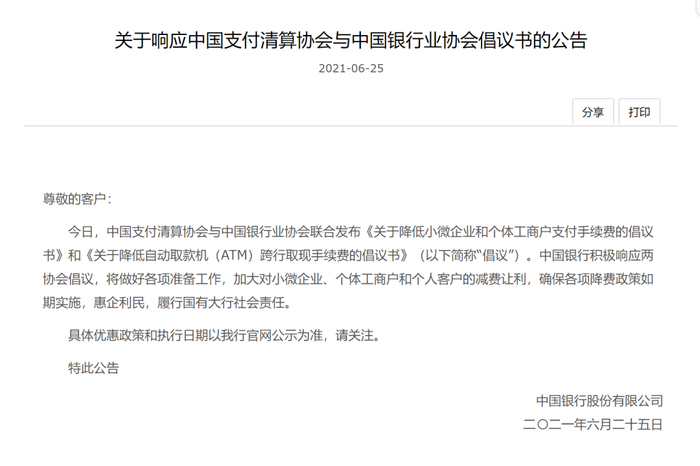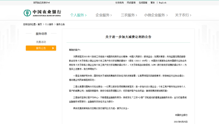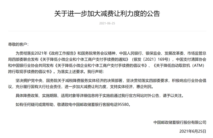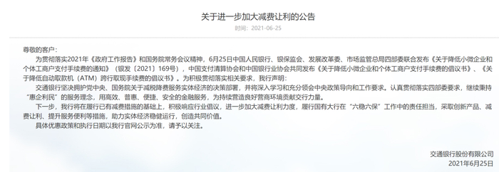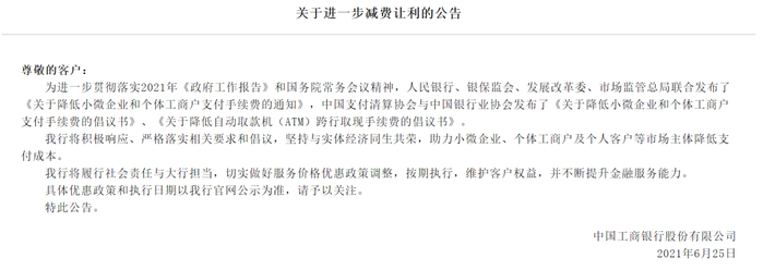 六大银行纷纷响应6月25日,农行、建行相继发布《关于进一步加大减费让利的公告》。