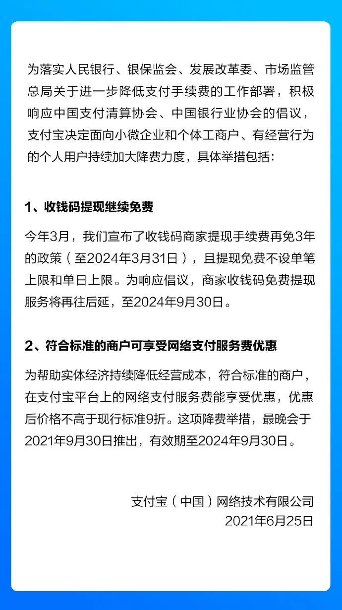 25日,支付宝宣布响应倡议,未来3年,收钱码提现继续免费;符合标准的商户可享受网络支付服务费优惠,最低打九折。这项降费举措,最晚会于2021年9月30日推出,有效期至2024年9月30日。今年3月,支付宝宣布将收钱码提现免费服务继续延期。