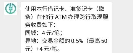 目前,中国农业银行借记卡跨行同城ATM取现,手续费为4元/笔。跨行异地ATM取现按交易金额的0.5%+4元/笔收取。