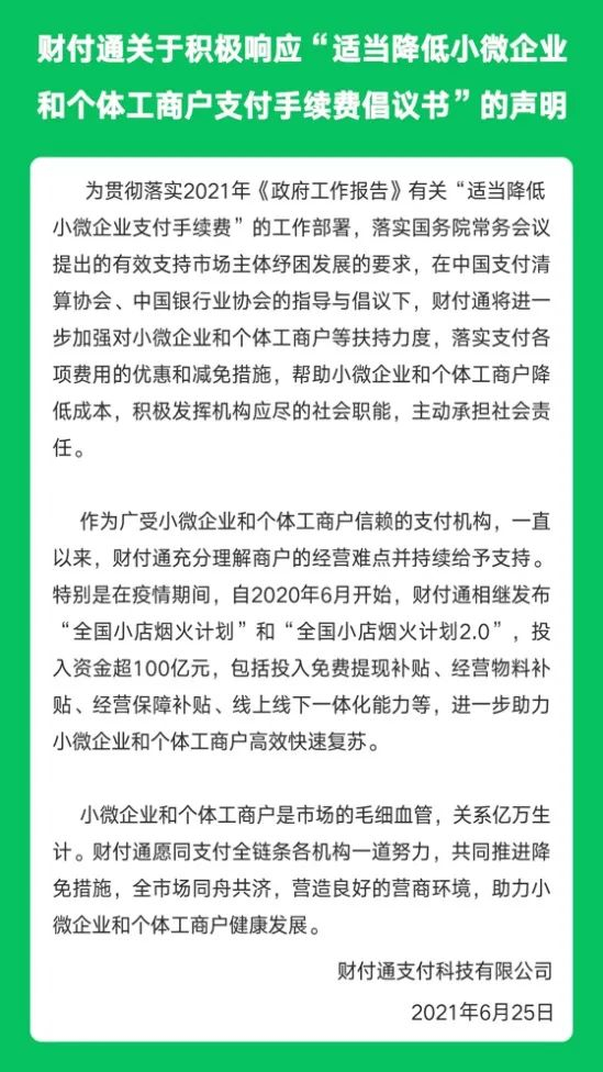 同日,财付通也发布声明:积极响应“适当降低小微企业和个体工商户支付手续费倡议书”