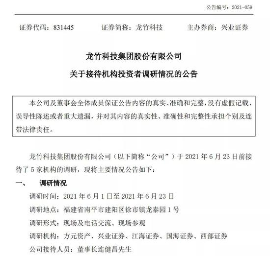 这已是龙竹科技今年第二次公告接待机构组团调研。此前在3月30日前,公司迎接了国金证券、兴业证券、中信证券、中银证券4家券商上门调研,回复了公司未来发展规划、设立控股子公司福建龙美创新实业有限责任公司的业务进展等问题。证券时报记者发现,兴业证券作为今年第一批调研公司的机构之一,显然意犹未尽,6月份又参与了第二批调研。