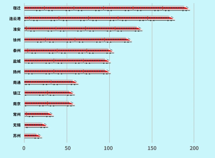 新图进一步优化苏北地区的客车开行结构,增开旅客列车16对,调整旅客列车运行区段15对。为了增加苏北各地至上海、南京等方向的运力,新图中增开宿迁(徐州东)至南京方向1对、台州至宿迁0.5对、徐州至上海方向2对、盐城至上海方向1对、连云港至上海方向3.5对高铁列车,其中连云港至上海的高铁列车由调图前10对增加至13.5对,苏北各城市往来沪宁间可供选乘的列车更多。