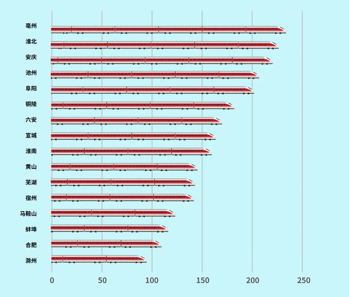 除此之外,商合杭高铁商合段新增多趟去往郑州、西安、重庆等方向的高铁列车,开行列车总数由调图前85对增加至91对,皖北人民群众乘着高铁看中国更便捷。合肥南至安庆间经由合安高铁首次开行一站直达列车,两地最快运行时间由调图前1小时14分钟压缩至52分钟。