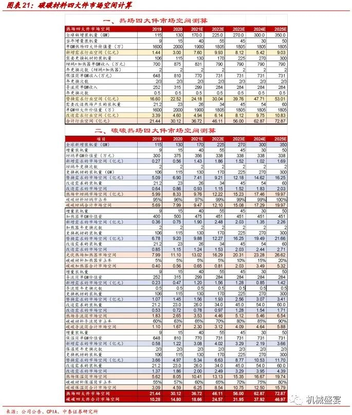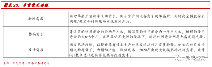 ②多重需求共振,行业景气度高。下游需求分为新增需求、替换需求和改造需求。根据公司可转债公告披露,公司的主要产品坩埚、导流筒、保温筒等均属于消耗品部件,主要应用于光伏晶硅制造领域的热场系统。其中坩埚每6-8个月就会进行替换,导流筒替换周期为2年,保温筒替换周期约为18个月,三重需求共振,行业空间巨大。据我们测算,热场四大件市场空间2021年为36.72亿元,其中碳基复合材料热场四大件的市场空间约为18.66亿元。