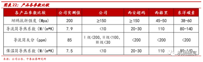 先进碳基复合材料热场产品相对于传统石墨原料产品具有明显性能优势。先进碳基复合材料热场产品与传统石墨产品比较,具有以下突出优点:①强度更高,产品使用寿命长。减低更换部件的频率,从而提高设备的利用率,减少维护成本;②导热系数更低,保温性能更好。有利于节能增效; ③有利于产品薄片化。从而可以利用现有设备生产直径更大的单晶产品,节约新设备投资费用;④安全性高。在反复高温热震下不易产生裂纹; ⑤可设计性强。大型石墨材料成型困难,而先进碳基复合材料可以实现近净成型,在大直径单晶炉热场系统领域具有明显的性能优势。