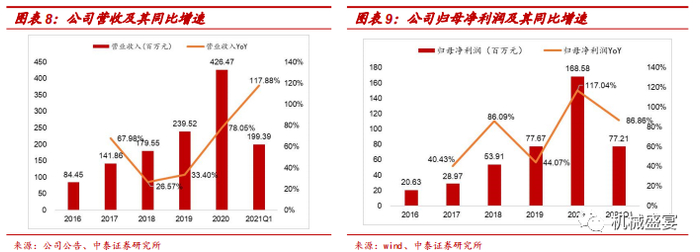 ②公司经营业绩持续优秀。公司营收和归母净利润维持高速增长;公司营业收入自2016年8445万元增长至2020年4.26亿元,复合增速高达38.25%,且营收增长呈现出加速上涨态势;归母净利润从2016年的2063万元增长至2020年的1.69亿元,复合增速高达52.22%。