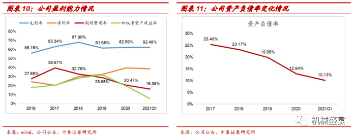 资产负债率不断优化。近年来,公司资产负债率整体呈现出持续下降的趋势。2021年一季度末公司资产负债率降至10.13%,公司资产结构进一步优化,偿债能力较强。2020年公司完成首次公开发行,募集资金到账使得公司资产负债率大幅下降。