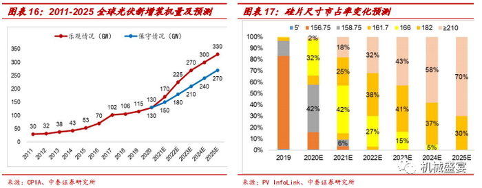 大尺寸高功率产品将进入快速放量阶段。根据中国光伏协会预计,大尺寸硅片占比将将迅速提升,210硅片和182硅片占比在未来将会超过50%,同时500W+和600W+的高功率电池片产品将会快速导入市场。2021年161-166mm尺寸的硅片将会成为国内硅片主流。