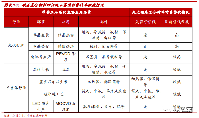 等静压石墨产品逐步进口替代,未来前景广阔。等静压石墨在高端制造领域的用途较广,高端品种依赖进口。目前先进碳基复合材料仅在光伏行业晶硅制造热场系统领域对其替代程度较高。基于先进碳基复合材料的性能优势及高端制造业国产化趋势,其对等静压石墨的替代前景广阔。
