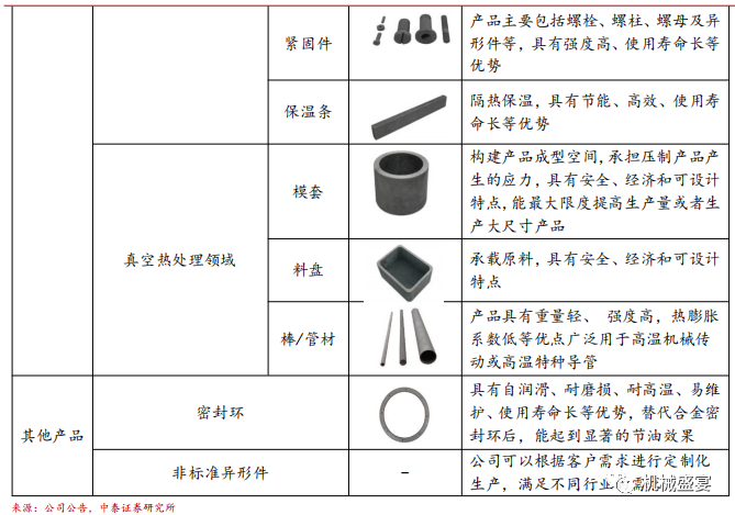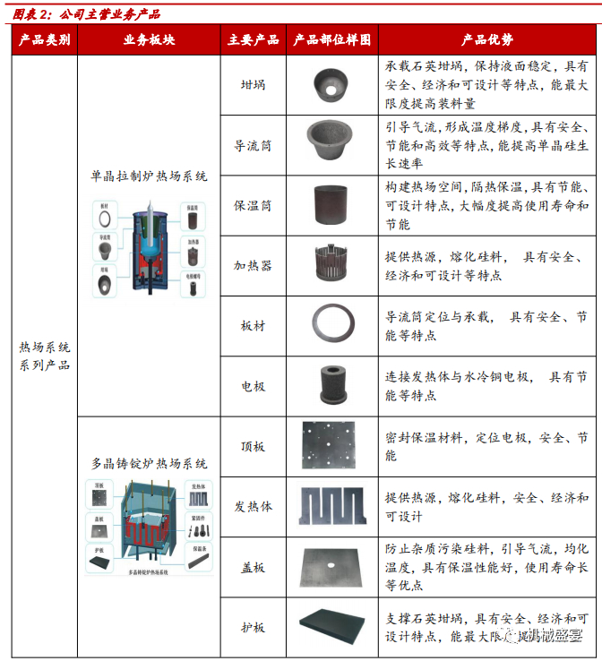 公司目前阶段主要产品为热场系统系列产品,包括单晶拉制炉热场系统、多晶铸锭炉热场系统和真空热处理领域。公司主要产品集中在单晶拉制热场系统,主要包括多种规格的坩埚、导流筒、保温筒、加热器等。公司大尺寸热场部件产品对单晶硅棒的直径大型化发展起到了支撑作用;同时,碳基复合材料热场部件大幅度提高了拉晶热场系统安全性,提升了拉晶速率,显著降低了单晶拉制炉的运行功率,促进节能降耗。