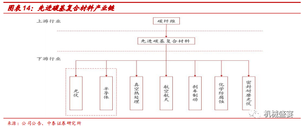 先进碳基复合材料简介。先进碳基复合材料是指以碳纤维为增强体,以碳或碳化硅等为基体,以化学气相沉积或浸渍等工艺形成的复合材料,主要包括碳/碳复合材料产品(碳纤维增强基体碳)、碳/陶复合材料产品(碳纤维增强碳化硅)等。产业链上游为碳纤维,下游应用于包括光伏、半导体、真空热处理、航空航天、刹车制动、化学防腐蚀和密封领域。