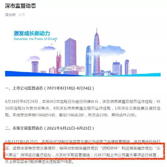当晚,深交所发布深市监管动态表示,继续对近期涨幅异常的“众兴菌业”持续进行重点监控。