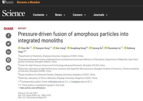 北京时间6月25日,这项成果被国际顶级期刊《科学》刊登。论文第一作者是浙江大学化学系博士生慕昭和孔康任,通讯作者是浙江大学化学系刘昭明研究员和唐睿康教授。研究工作获得华东师大姜凯副研究员、北京高压科学中心董洪亮博士和浙大求是高等研究院徐旭荣教授的支持。