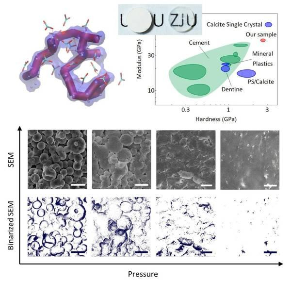 由于新的制备模式做出来的碳酸钙块状材料具有连续结构,它的光学透过性和机械性能都非常好,硬度为2.739 GPa,弹性模量为49.672 GPa,这些性能优于大多数的水泥基块体材料,甚至与方解石单晶的性能相近。而且这种方式不需要高温,所以制备起来也比较快速方便。“如果未来能把所需压力降下来,就更加贴近实际应用了。”孔康任说。