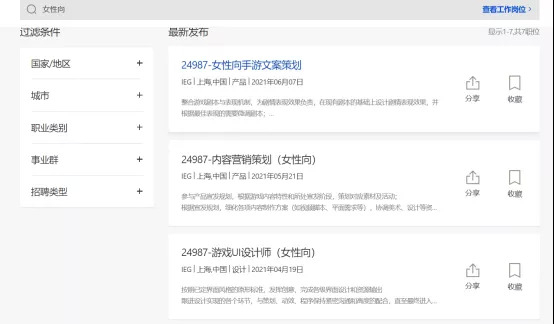 例如在腾讯官网搜索“女性向”关键的词的岗位,几乎都是围绕文案、营销和设计展开(当然也可能是其他岗位暂时不需要)。