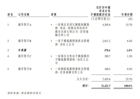 例如玩友时代IPO披露的委托弗若斯特沙利文调研国内女性向市场分析报告可以看到,A公司大概率是腾讯,但《光与夜之恋》是首款自研,在此之前其第一的份额中包含休闲(消消乐等)、发行《食物语》、《偶像梦幻祭》等诸多产品。