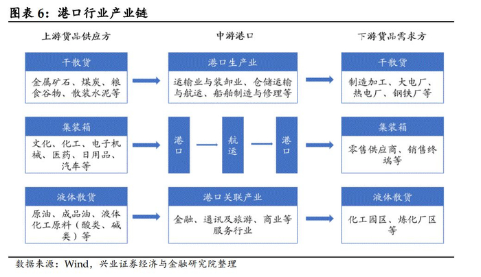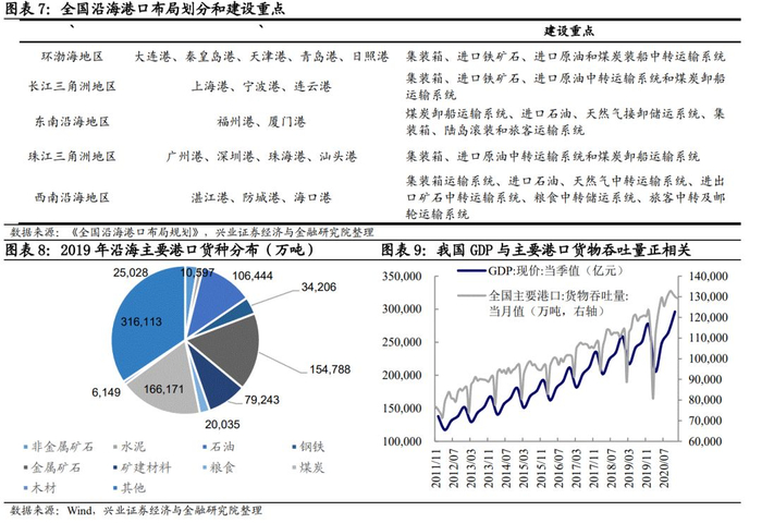 作为国民经济和社会发展的重要基础行业,港口行业与宏观经济、对外贸易景气度息息相关。港口具有船舶进出、停泊、靠泊,旅客上下,货物装卸、驳运、储存等功能,经转的货种主要有干散货、油料、集装箱产品。港口的吞吐量和贸易、钢铁、电力、石油等行业关系紧密,从历史数据看,港口吞吐量增速和 GDP、进出口贸易呈正相关。此外,港口也是对区域经济发展有重要功能的基础设施。