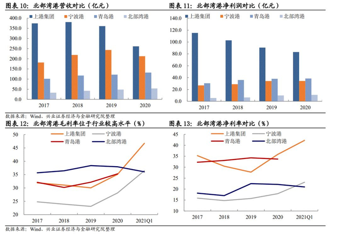 2020 全年北部湾港实现营业收入/归母净利润 53.63/10.76 亿元,同比上升11.90%/9.29%,虽然疫情冲击下贸易顺差收窄,但公司充分受益于“一带一路”等政策和港口升级转型,有效抵御了行业风险。2020 年北部湾港货物吞吐量完成 2.38亿吨,同比增长 16.21%;其中集装箱完成 505 万标准箱,同比增长 32.23%。报告期内,公司综合毛利率 38.39%,与 2019 年基本持平。费用方面,公司管理/财务费率为8.32%/4.30%,较上年同期变动0.15/0.16个百分点,管理费率上升是因为吞吐量增加导致效益工资增加、按进度确认了限制性股票激励成本、无形资产摊销增加等,财务费率抬升则系票据贴现及平均带息负债规模同比增加,以及募集资金存款利息减少所致。期间费率上升侵蚀了部分净利率,2020年公司净利率21.98%,同比下降0.34个百分点。单Q4公司营业收入/归母净利润15.47/2.39 亿元,同比变动8.06%/-9.12%,归母净利下降主要因期内报废固定资产、增加对外捐赠等营业外支出比去年同期增加0.49亿元。公司毛利率33.52%,同比下降5.48个百分点,期间费率下降0.81个百分点。毛利率下滑幅度较大,主要因为营业成本同增17.76%,原因为:1)去年同期享受疫情期间减免的社保费用和轮换工改制转录导致人工成本增加;2)为了打造绿色港口,环保支出增加。单Q4管理/财务费率10.25%/3.75%。公司四季度实现净利率17.13%,同比下降2.82个百分点。