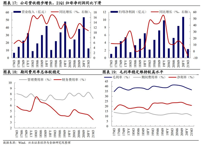21Q1公司实现营业收入/归母净利润12.50/2.32 亿元,同比变化10.78%/-6.85%,其中归母净利同比下滑主要受部分子公司所得税优惠政策到期导致所得税费用同比增加 41.89%,以及子公司广西北部湾的少数股东持股比例增加的影响。 报告期内,公司综合毛利率 36.52%,比上年同期减少4.74个百分点,管理/财务费率为7.23%/3.50%,较上年同期分别减少0.43/1.74个百分点,财务费率下降明显是因为平均贷款利率下降。费率水平总体下降,部分弥补了公司利润,公司净利率20.84%,较上年同期下降2.61个百分点。