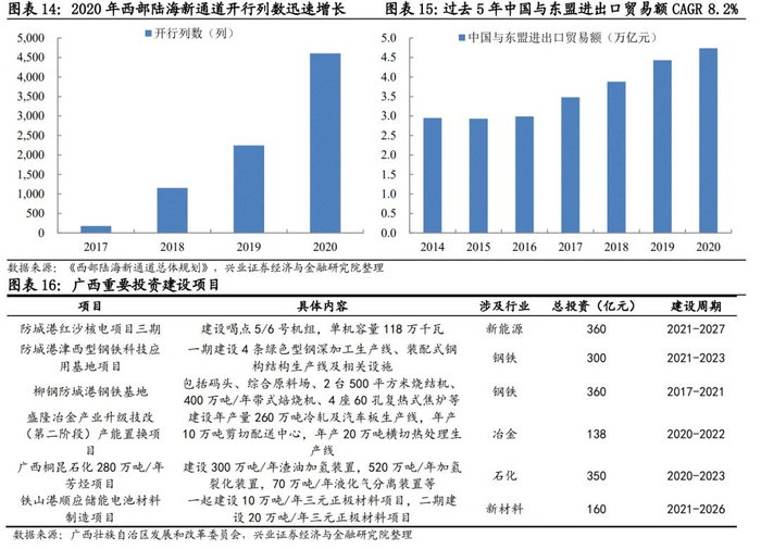 大宗商品运输业务将持续保持高增量。近年来广西大力统筹推进钢铁、能源、石化、冶金、材料等产业的重大项目,对红沙核电、钢科技基地、柳钢基地等项目投资均超过300亿,建设终止年限从2021年到2027年不等。在项目建设和投产过程中,对大宗商品需求旺盛,有望为北部湾港带来未来1-6年的业务增量。