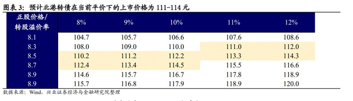 静态看,预计目前平价下北港转债上市首日获得的转股溢价率在8%-12%区间内,价格为111-114 元。