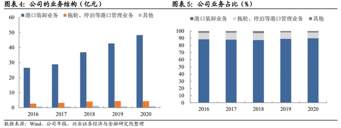 公司业务包括了集装箱和散杂货的港口装卸、堆存及船舶港口服务等。公司主营港口码头建设、国际国内集装箱、内外贸件杂散货装卸等,目前已发展成以集装箱、件杂货、散货运输和客运码头为主,为内外贸运输服务的综合性商贸港口企业,与100多个国家和地区的 250 多个港口有贸易往来。