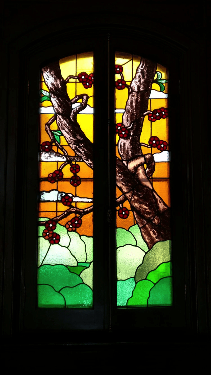科学会堂一号楼修复完成后,目前已对外开放(目前仅接受团体预约参观)。走进室内,深红色的地板上铺着欧式风情的地毯,在昏黄柔和的灯光下,散发着复古的味道,厚重的木质旋转楼梯、漂亮的彩绘玻璃也让整个空间神圣而又浪漫。