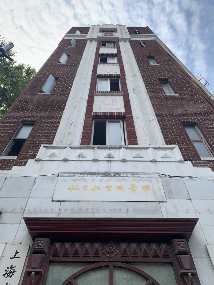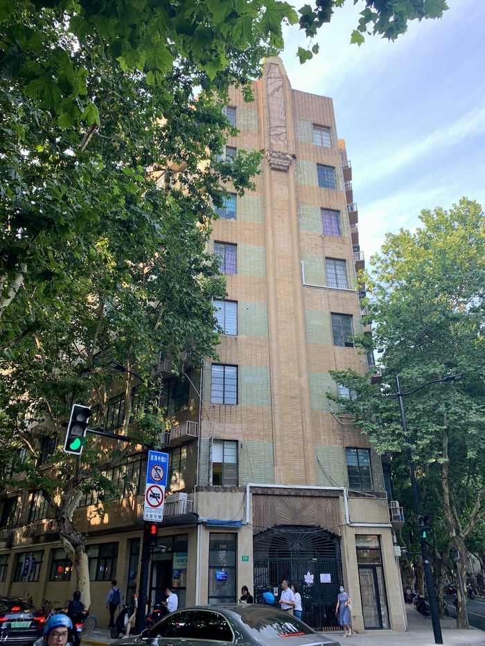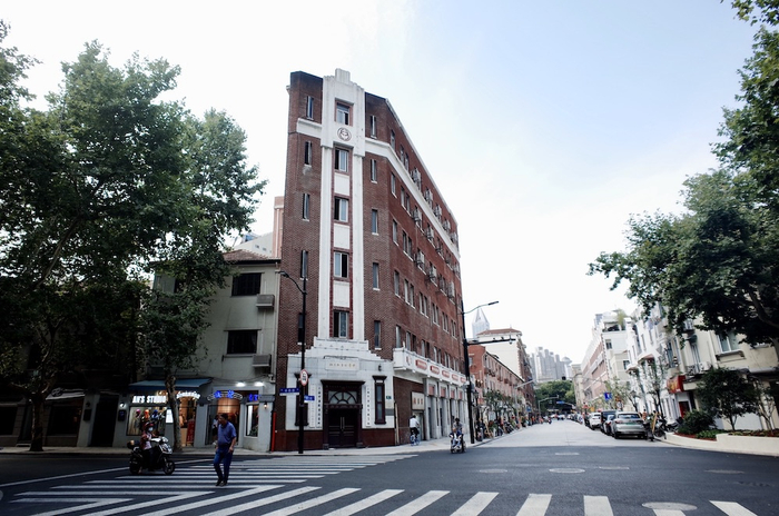 在雁荡路和南昌路交汇的路口,坐落着一栋低调而优雅的六层欧式风格老建筑,棕褐色的外立面,呈南窄北宽结构,南立面略带装饰图案,门楣上清晰地写着: