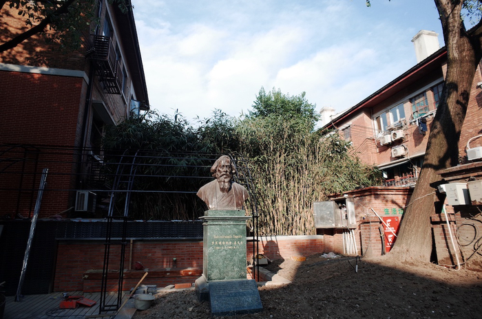 一座泰戈尔铜像,矗立在南昌路和茂名路路口的小广场上。