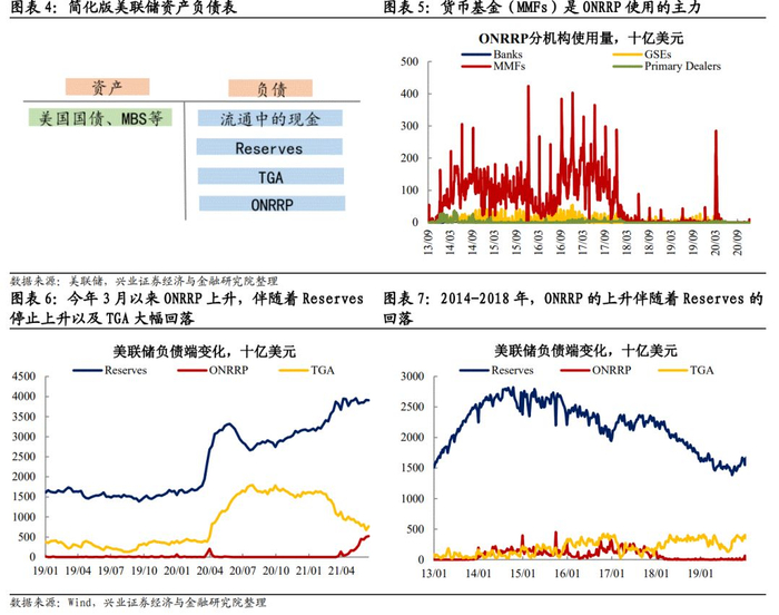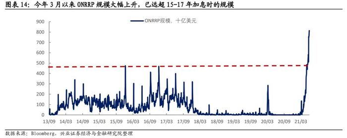 今年ONRRP规模上升和2013-2018年ONRRP规模上升有何区别?这次ONRRP规模上升开始于3月末,与SLR豁免结束的时间一致,这进一步印证了上文所阐述的逻辑:SLR豁免结束——银行 reserves向MMFs转移——货币市场“资产荒”——MMFs不得不使用ONRRP。ONRRP 规模上升不会是暂时的,当前只是开始,远非结束。巴塞尔协议 III 的影响是历史性的,MMFs将代替存款机构成为金融市场流动性的来源,MMFs规模的膨胀必然伴随着ONRRP使用量的上升。3月17日美联储在宣布SLR豁免不会延期的同时,将ONRRP单一机构的使用量上限由300亿美元调高至800亿美元,这不是巧合,ONRRP规模的飙升已在美联储预期之中。美联储上一轮退出宽松,也伴随着ONRRP规模的上升,这次ONRRP上升是否代表美联储收紧流动性呢?答案是否定的。上一轮退出宽松的时候,“巴III”还未开始实施,ONRRP 规模上升确实是帮助抽离流动性,ONRRP利率本身也是 target range的下限。而当前ONRRP规模上升更多出于联储的无奈,并不代表紧缩,因为收紧的第一个步骤必然是扭紧“水龙头”(Taper)。合乎逻辑的理解是,ONRRP规模膨胀将成为驱动美联储开启 Taper 的一个技术性原因,也就说是成为货币收紧的一个诱因。池子里的水都满得往外溢了,继续开水龙头还有何意义?