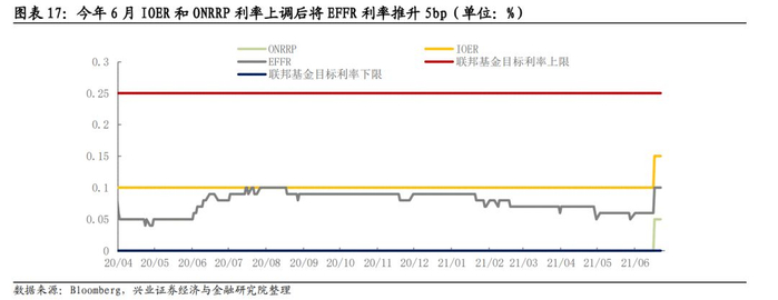 从更深层次理解,上调IOER和ONRRP利率,与ONRRP规模上升,背后的逻辑是一致的。调整前 ONRRP 和 IOER 构成的 EFFR 上下限是 0-0.1%,FFR 目标区间是 0-0.25%,也就是说,IOER 发挥主要作用(binding),使 EFFR 保持在目标区间的中点附近。但是SLR豁免取消导致存款机构扩张 reserves 的动力不足,借 EFFR 的需求下降导致 EFFR 向下偏离IOER,进而带来 IOER-EFFR 利差走阔。另一方面,流动性从 reserves 转移至MMFs,导致回购市场堆积大量过剩流动性,将tri-party repo rate和国库券利率压至零,所以 MMFs 开始使用 ONRRP 工具。ONRRP开始发挥作用(binding),意味着这次虽然同时上调了 IOER 和 ONRRP 利率,但最核心的是ONRRP。在未来美联储退出宽松的过程中,ONRRP作为“硬下限”都将是美联储最为重要的“武器”。